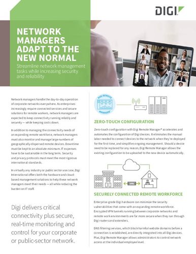 Keep track of all your vital connections with one central management platform, Digi Remote Manager®. With Digi Remote Manager, your IT team has complete control and is able to easily and securely monitor and configure devices remotely. And all of these solutions enable you to offer flexible work arrangements long into the future.