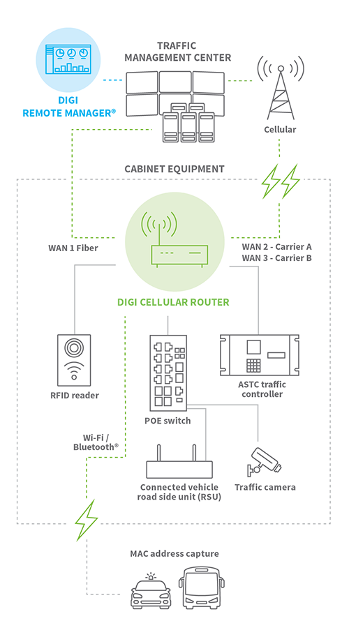 The Digi cellular routers in your traffic management network can be quickly configured using Digi Remote Manager®, and then managed remotely from a single platform. This secure, hosted application lets administrators monitor and troubleshoot their systems as well as perform mass configurations or simultaneous software updates. Digi Remote Manager offers a single point of command and control, along with system-wide monitoring that includes dashboards to view performance metrics, and automated alerts for specified conditions and thresholds. Digi Remote Manager can generate reports ranging from daily summaries to detailed period-based metrics. It also helps with the integration of legacy systems into the traffic management network. For example, new devices added to the system can be configured quickly in Digi Remote Manager from saved configurations to either swap out devices or scale up the installation with more devices.