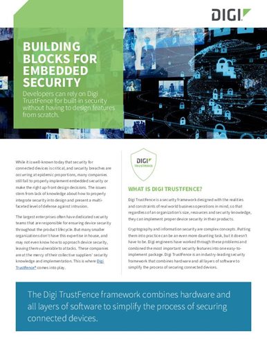Digi TrustFence provides data authentication and device identity management options. Furthermore, TrustFence ensures that products are not shipped with default user and password settings.