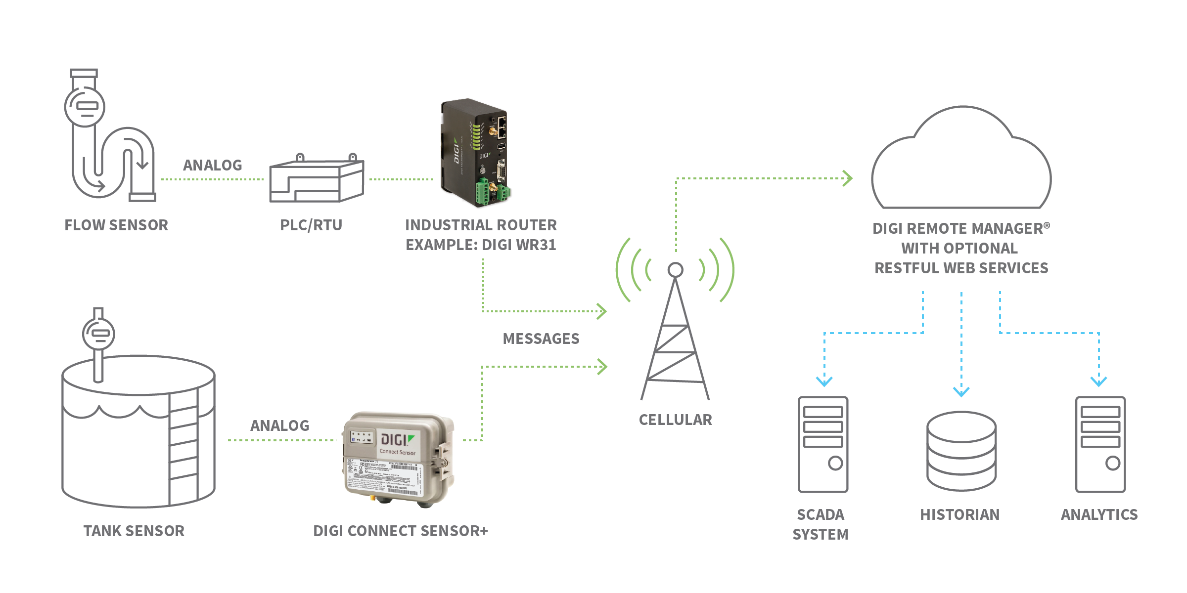 In IoT devices and applications, sensors act as the "eyes and ears" of installations in a vast range of use cases from oil and gas to agriculture, C&I metering, industrial tanks, municipal wastewater systems, security systems and more. There are a wide range of components from a variety of Digi partners that can monitor and capture data about their environment – motion, temperature, humidity, volume, pressure, flow, acceleration, sound, light – essentially anything that moves or fluctuates in some way.